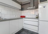 De moderne keuken is uitgerust met diverse inbouwapparatuur, waaronder een inductiekookplaat.