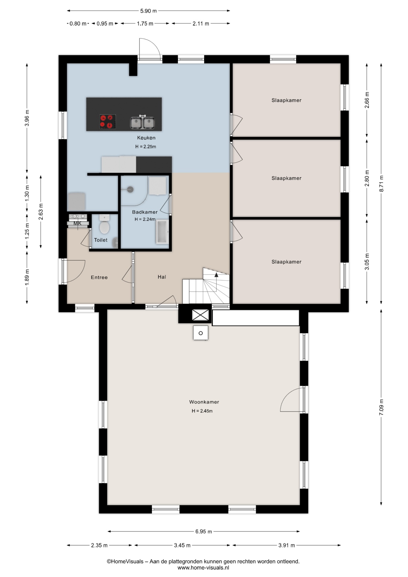 Verder vind je hier drie ruime slaapkamers en een badkamer met douche. Naast de hal is het aparte toilet te vinden.