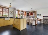 Bij binnenkomst in de hal vind je de meterkast, de trapkast, het toilet en de trapopgang. De lichte woonkamer van circa 50 m² heeft grote raampartijen, een erker en openslaande deuren naar de tuin. De half open keuken in L-opstelling is aan de achterzijde gelegen (circa 14 m²) en is uitgerust met diverse inbouwapparatuur zoals een vrijstaand fornuis, afzuigkap, combi-oven, koelkast en vaatwasser (2022) en handige kasten voor extra opbergruimte. De gehele begane grond is afgewerkt met plavuizen en heeft vloerverwarming.
