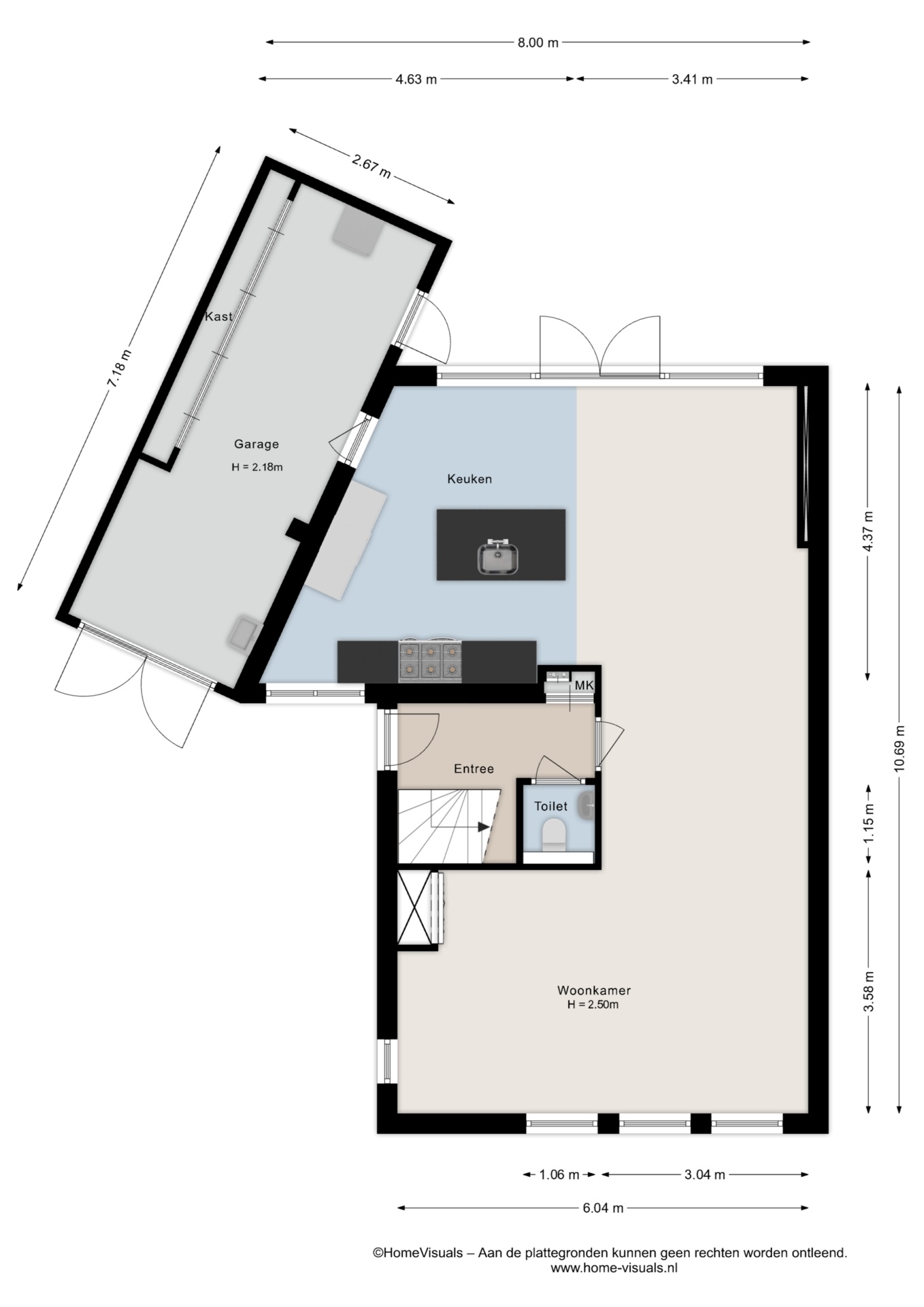 De begane grond bestaat uit een entree met hangtoilet en fonteintje, een ruime U-vormige woonkamer met gashaard en een moderne woonkeuken met spoeleiland, veel bergruimte en hoogwaardige apparatuur zoals een SMEG-fornuis met twee ovens, inductiekookplaat, wasemkap, vaatwasser, magnetron en koelkast. Vanuit de keuken is er toegang tot de geïsoleerde garage met vloerverwarming, spoelbak, vaste kasten en vliering.