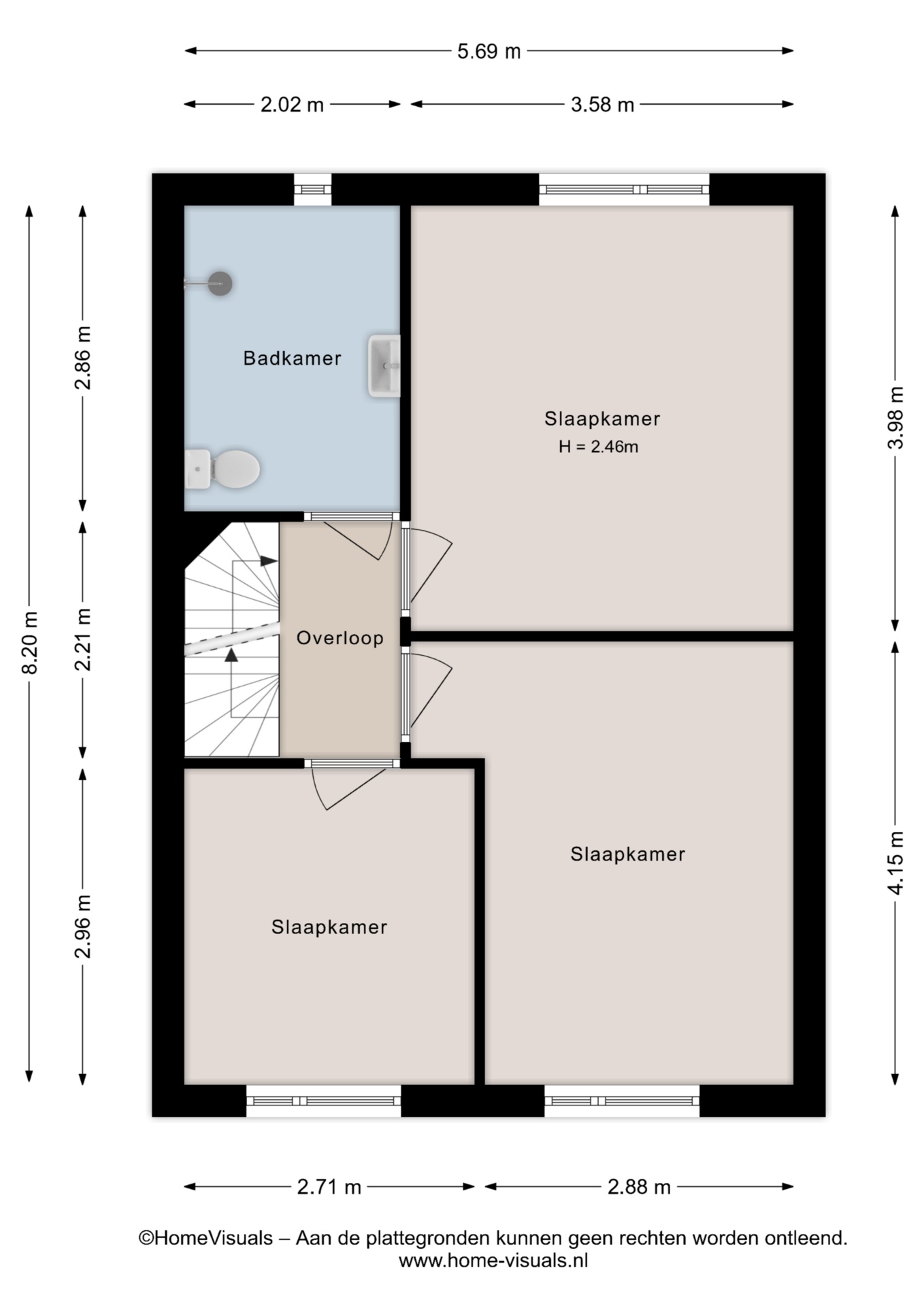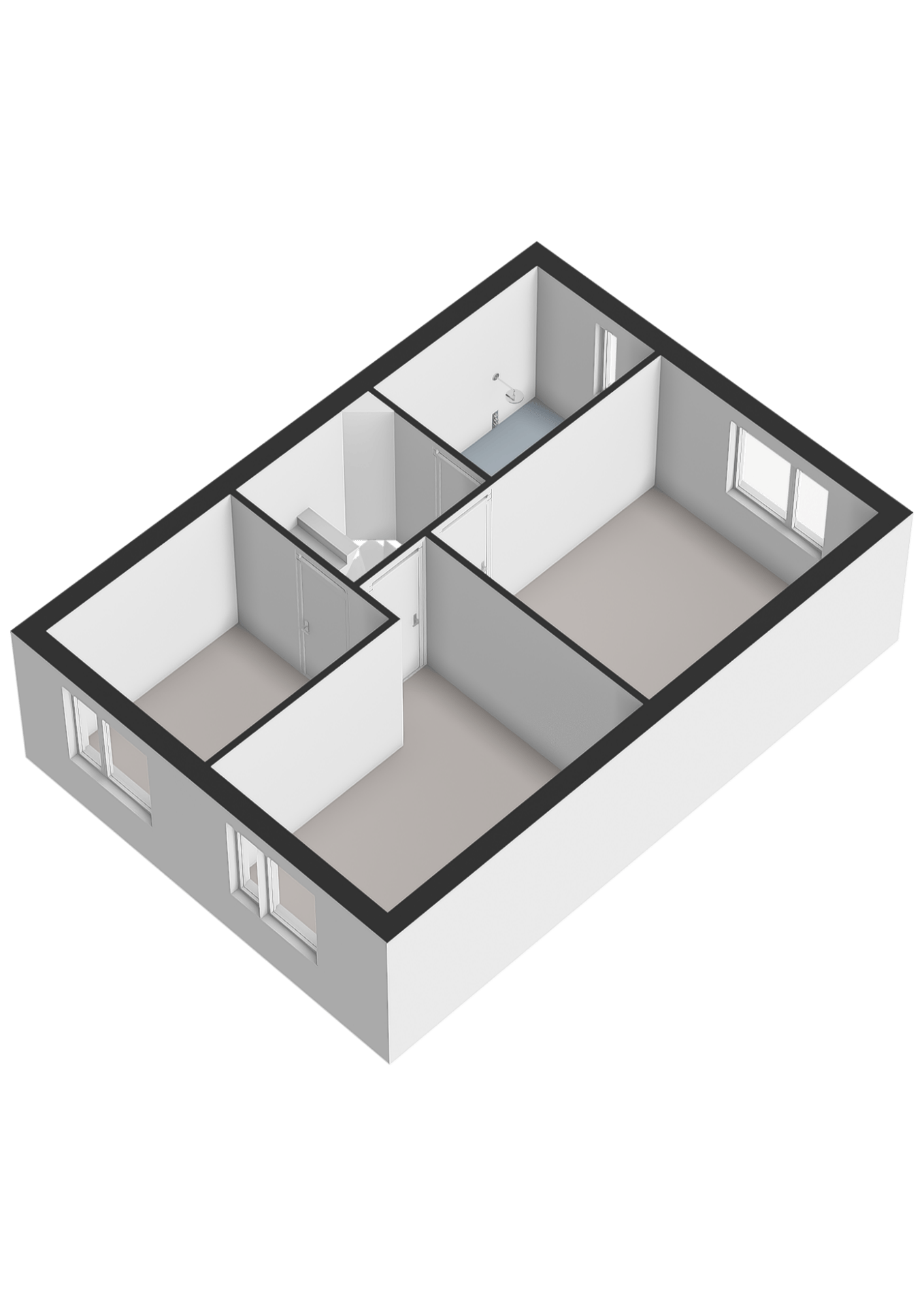 Overloop met toegang tot drie slaapkamers en de badkamer. De badkamer is uitgerust met een inloopdouche, wastafel en toilet.