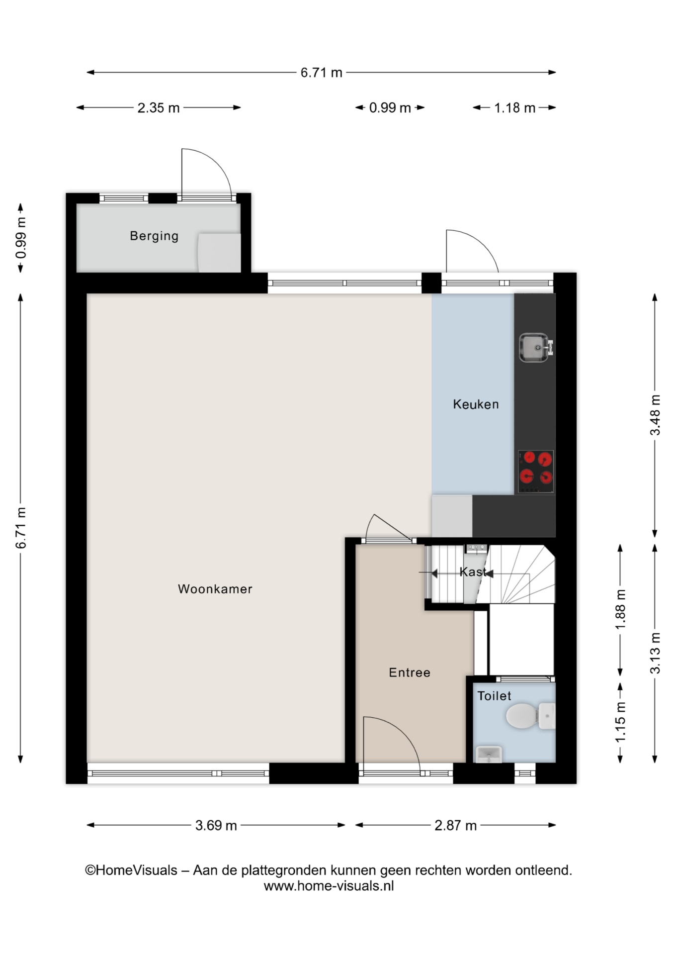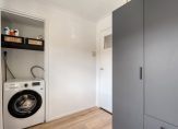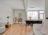 Entree met trapkast en toilet. Sfeervolle, vergrote woonkamer met strakke wanden en veel lichtinval. Moderne open keuken met inbouwapparatuur en tuindeur naar de zonnige, besloten achtertuin.