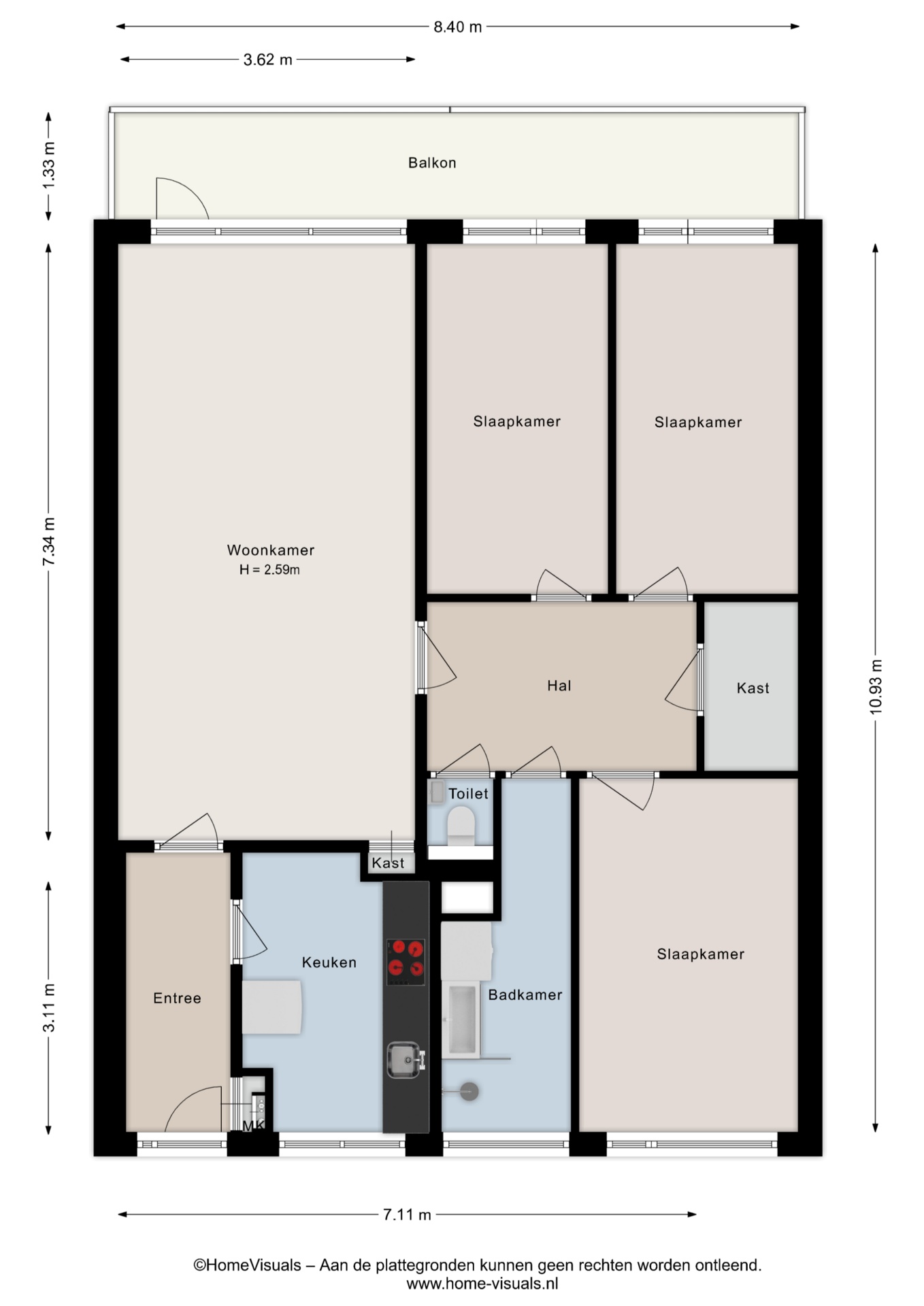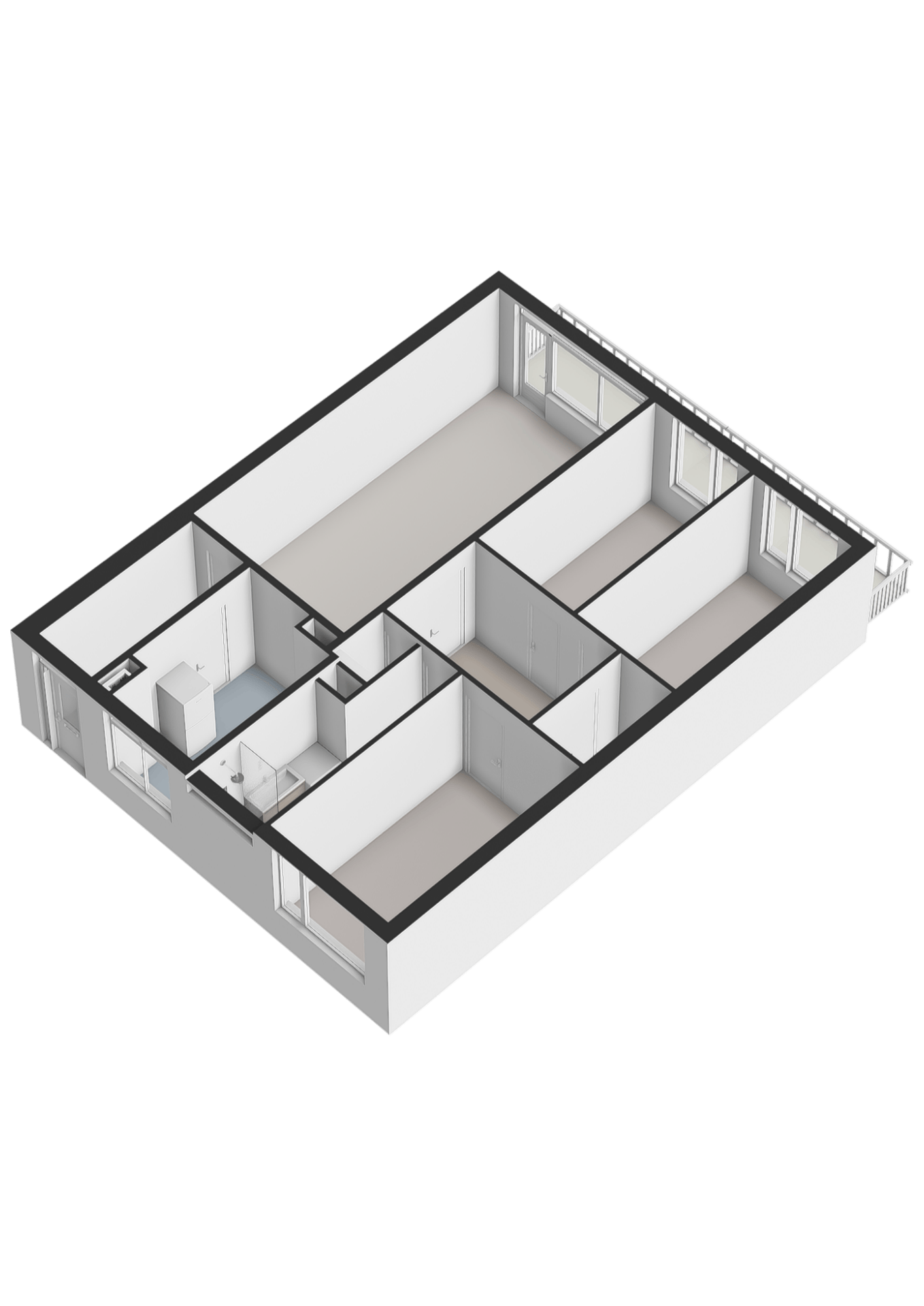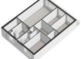 Vierde woonlaag: entree/hal met meterkast, toegang tot de moderne keuken, lichte woonkamer met balkon, drie slaapkamers, toiletruimte en badkamer.