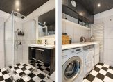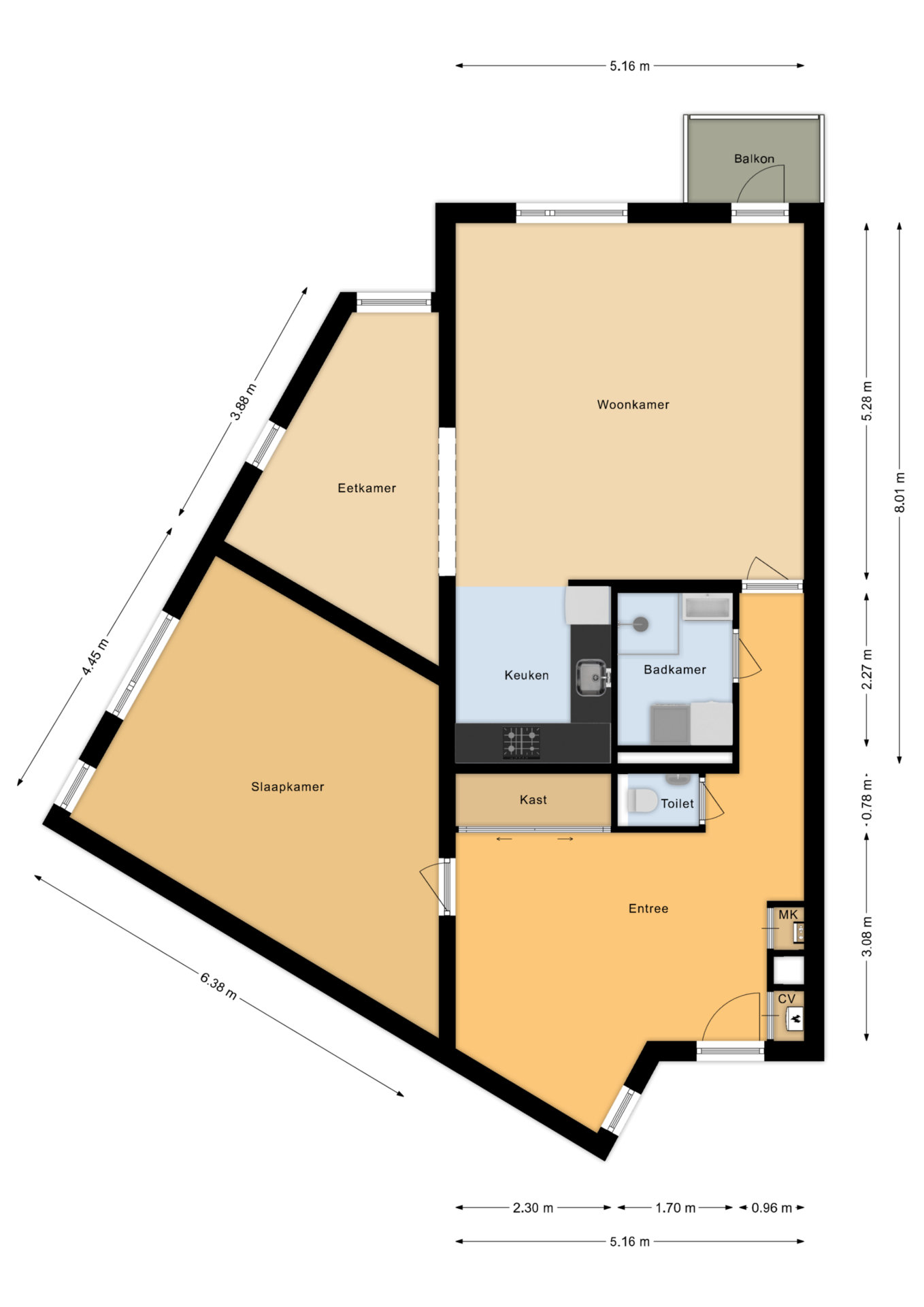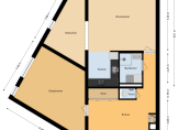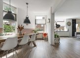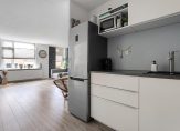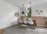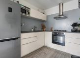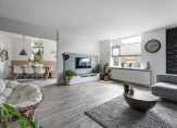 Vanuit de hal bevindt zich aan de voorzijde de speelse en zonnige woonkamer alsook de moderne keuken en ruime eetkamerhoek. Het balkon is te bereiken middels een deur in de woonkamer.