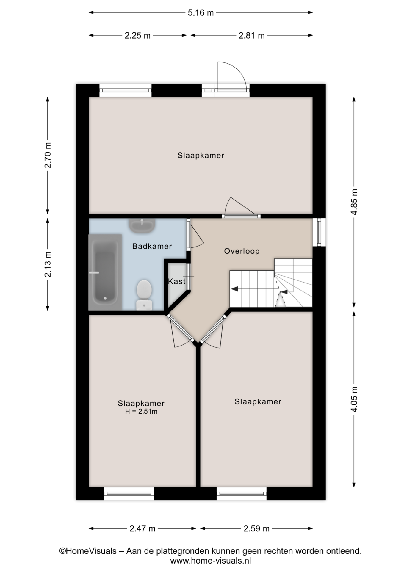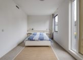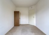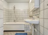 Overloop met daglicht en drie slaapkamers, waarvan één met toegang tot het platte dak. De badkamer is eenvoudig maar praktisch ingedeeld met ligbad, wastafel en toilet.