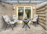 De achtertuin is verzorgd aangelegd met een combinatie van bestrating en groen. Bij de schuifpui zit je heerlijk beschut onder de overkapping. Daarnaast zijn er een houtopslag en een achterom aanwezig.