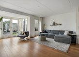De tuingerichte woonkamer met prachtige eiken vloerdelen loopt naadloos over in de serre, die voorzien is van sfeervolle tuindeuren naar het terras.