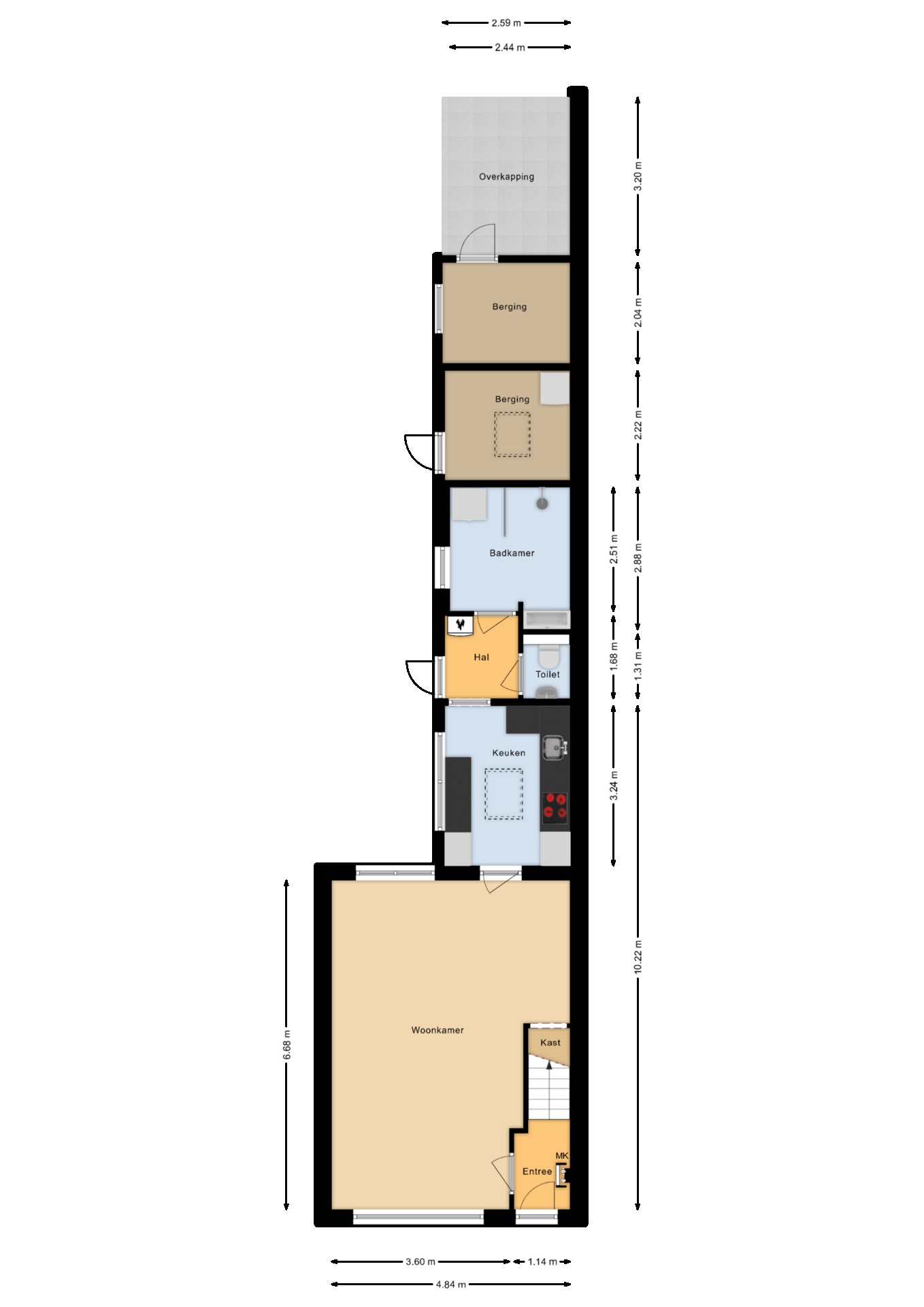 Vanuit de ruime voortuin kom je binnen in de hal; de gezellige woonkamer is lekker licht, voorzien van vloerverwarming ; de nette dichte keuken is heeft een inductiekookplaat, Quooker en koelkast. Via een halletje met CV opstelling en toiletruimte komen we bij de badkamer met inloopdouche, wastafelmeubel en wasmachineaansluiting. Ook lekkere warme voeten in de badkamer dankzij de vloerverwarming.