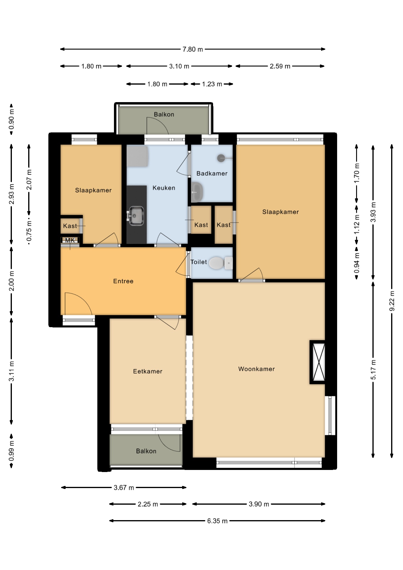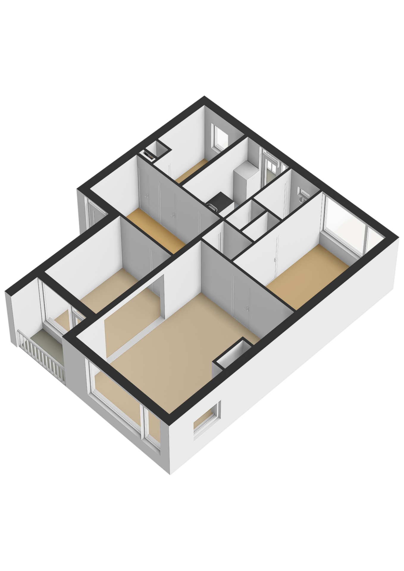 Via de centrale hal kom je binnen in het trappenhuis met de postbussen. Beneden is de berging en via de trap kom je bij de voordeur van je appartement. De gang geeft toegang tot de diverse vertrekken van de woning, o.a. de slaapkamers, badkamer en woonkamer. De woonkamer is royaal opgezet en biedt voldoende ruimte voor zowel een zit- als een eetgedeelte. Dankzij de grote ramen en het aangrenzende balkon geniet je hier van veel natuurlijk licht. De keuken is eenvoudig, hier vind je ook de Cv-ketel en heeft een toegangsdeur naar het tweede balkon aan de achterzijde. Ook de badkamer met douche is eenvoudig en dit is de plaats voor de wasmachine.