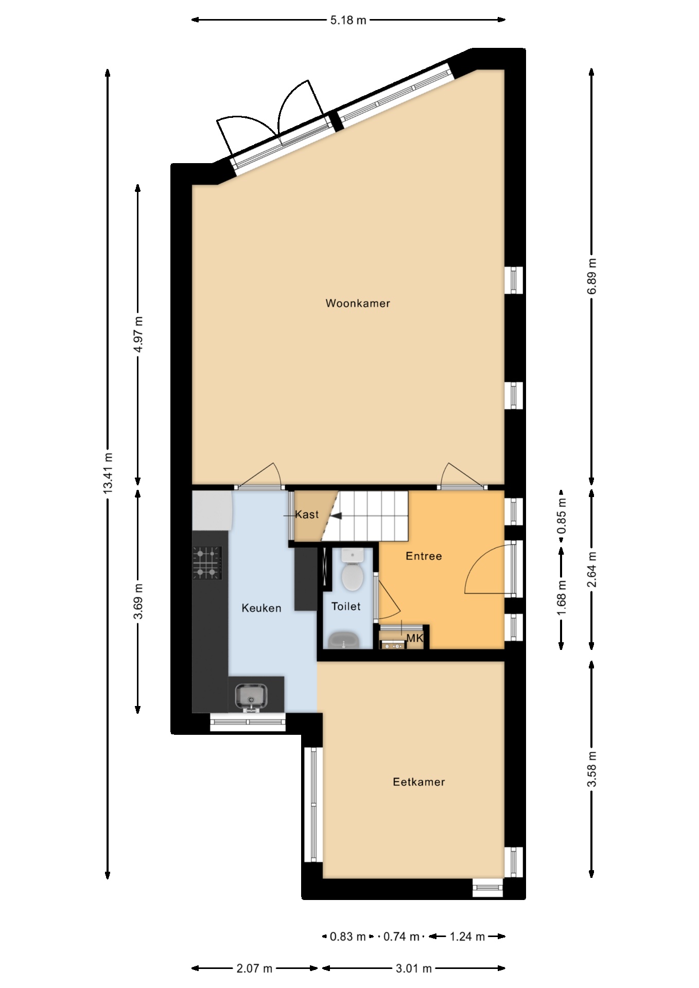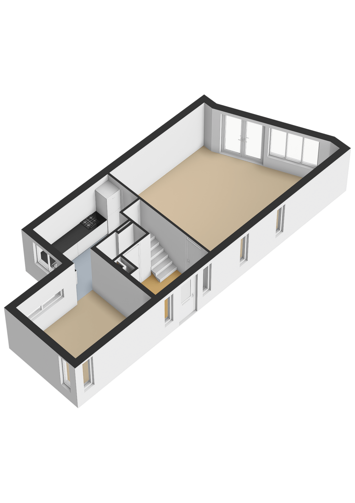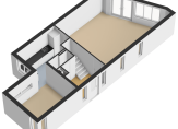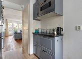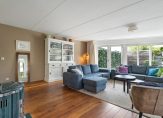 Bij binnenkomst wordt je ontvangen in de lichte ruime hal met garderobe, meterkast, vaste trap naar verdieping en toegangsdeur naar de woonkamer. De woonkamer voelt heerlijk licht aan met veel natuurlijk licht dankzij de grote ramen aan de tuinkant en de zijramen. Het originele ontwerp zie je hier ook direct terug, kijk eens naar de schuine achterpui! De houten plankenvloer geeft een warme sfeer.