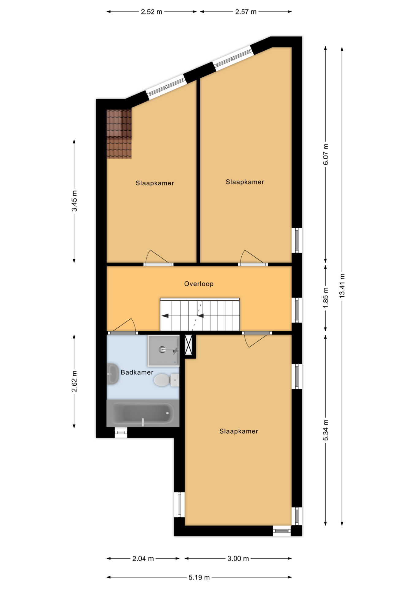 De overloop is ruim en heeft natuurlijk licht, er zijn hier drie ruime slaapkamers en een badkamer. Alle kamers hebben leuke nisjes en een eigen indeling.