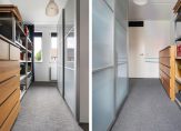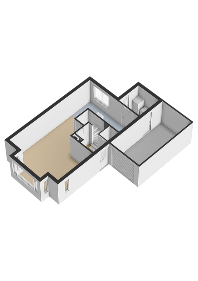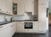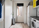 Zijentree met meterkast, trapopgang en toilet. Een sfeervolle L-vormige woonkamer met erker en handige trapkast. Aansluitend bevindt zich de halfopen keuken, uitgerust met alle benodigde inbouwapparatuur in een tijdloze, neutrale stijl. De bijkeuken biedt aansluitingen voor witgoed en geeft toegang tot zowel de garage als de zonnige tuin.