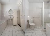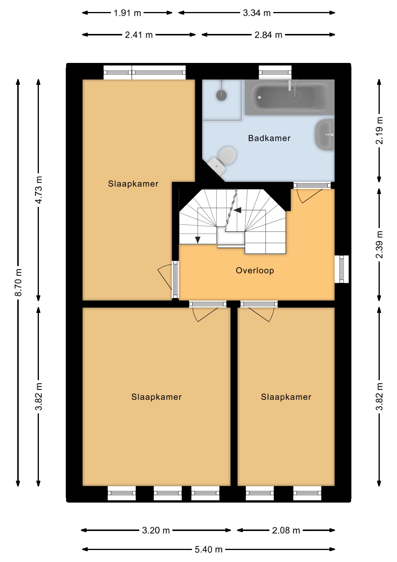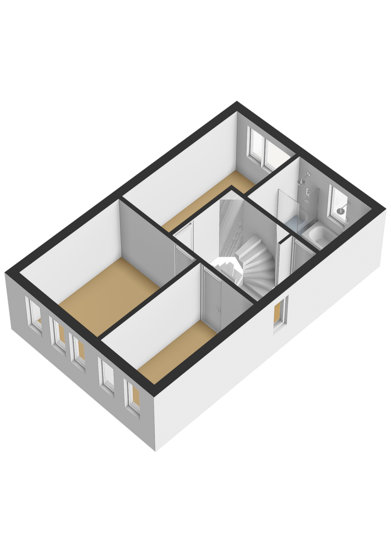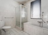 Overloop met zijraam, drie ruime slaapkamers en een complete badkamer voorzien van ligbad, aparte douche, toilet en wastafel.