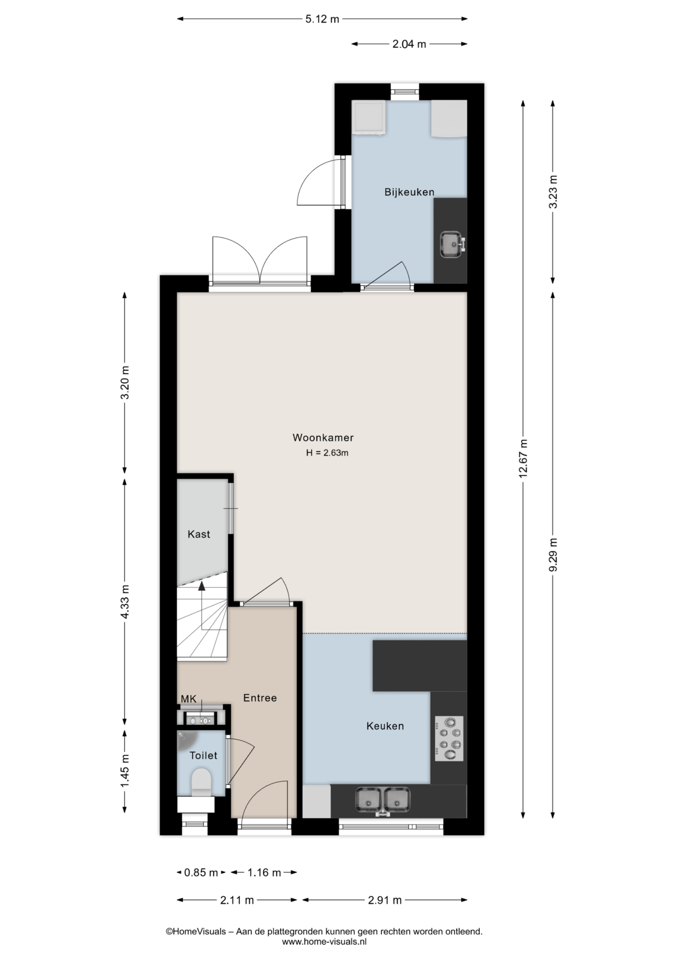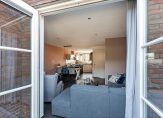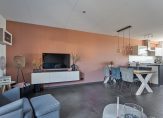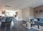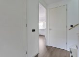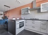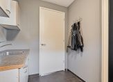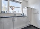 Via de entree kom je binnen in een lichte en royale woonkamer, waar je direct de openslaande deuren naar de tuin ziet. De strak gestucte wanden (met renovlies) en de vloer met vloerverwarming zorgen voor een rustige, comfortabele sfeer. Aan de voorkant van de woning vind je de U-vormige open keuken, die is uitgerust met alle benodigde inbouwapparatuur en veel werk- en opbergruimte. Aangrenzend is de praktische bijkeuken, die beschikt over witgoedaansluitingen en biedt volop bergruimte.